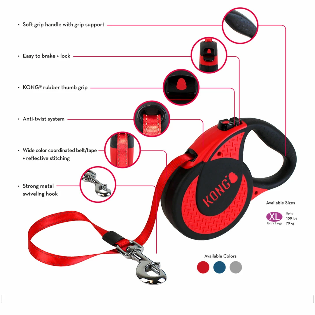 - The KONG Terrain retractable leash is available in the following colours: black, red, blue, gray and pink.