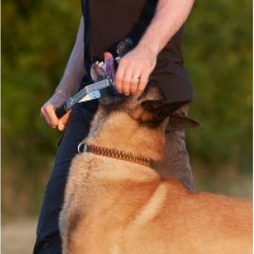 The angle at the position bar is fixed with a thumbscrew and can be removed. The angle is used when the dog presses the dog handler during the footwork. The angle of the position rod is guided on the left leg of the handler.